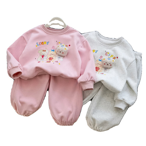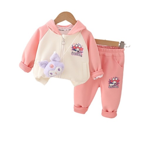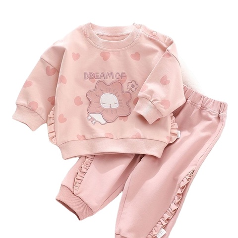 Conjunto de niños al por mayor, conjunto de Sudadera con capucha informal para niñas pequeñas, de dibujos animados Sudadera con capucha, pantalones, conjunto de dos piezas para niñas de 1 a 7 años