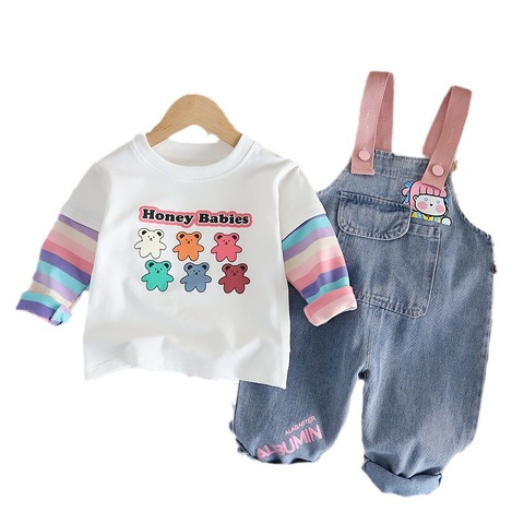 Conjunto de primavera y otoño para niña, Sudadera con capucha de algodón con estampado de dibujos animados y monos de mezclilla, conjunto de dos piezas de 1 a 6 años